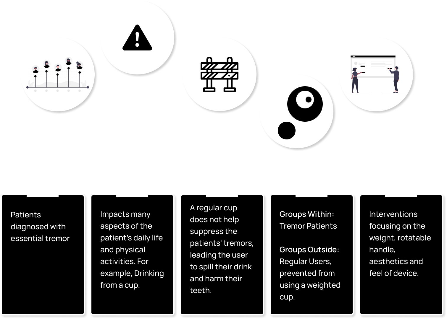How might we develop a user-friendly and affordable assistive technology solution that empowers essential tremor patients to regain independence in performing everyday tasks, such as drinking from a standard cup, effectively improving their quality of life and eliminating the need to endure the stigma of traditional treatment options?